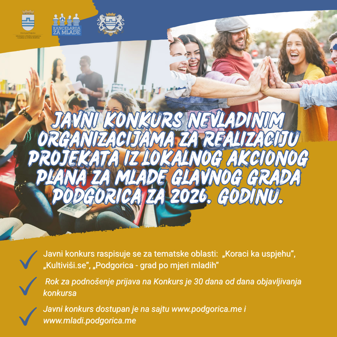 Javni konkurs nevladinim organizacijama za realizaciju projekata iz Lokalnog akcionog plana za mlade Glavnog grada Podgorica za 2026. godinu