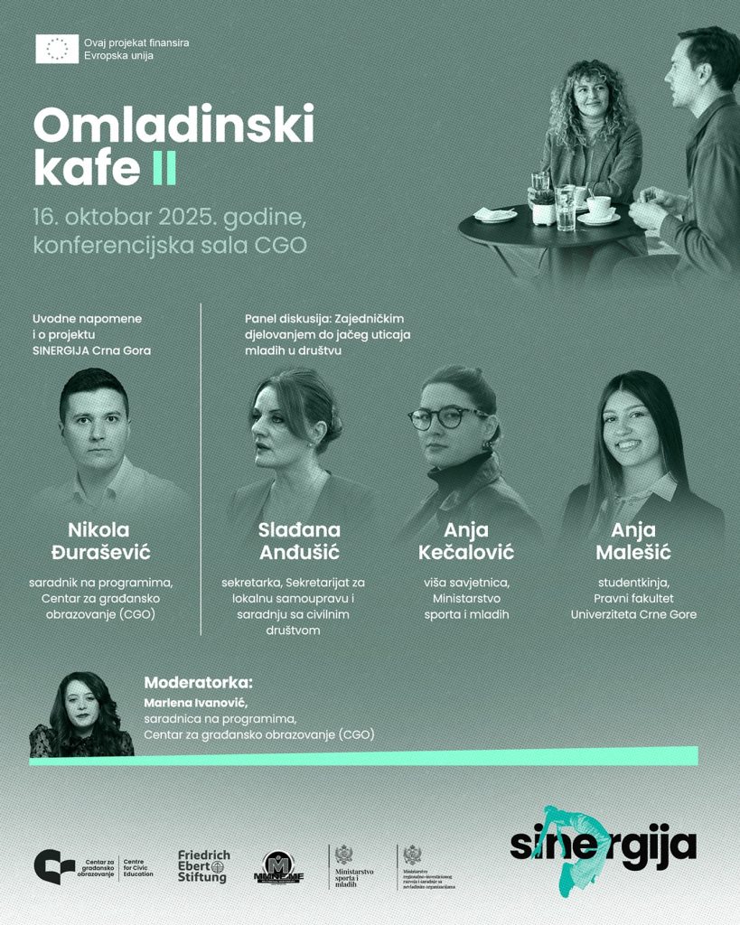 Pridruži nam se 16. oktobra u 11.00 u konferencijskoj sali #CGO na Omladinskom kafeu, gdje mladi i donosioci odluka, zajedno traže rješenja za bolje omladinske politke. Razgovaramo o obrazovanju, zapošljavanju i perspektivama za mlade. Kolega Nikola Đurašević će predstaviti program #SINERGIJA, čiji su dio i Omladinski kafei, nakon čega slijedi panel diskusija na kojoj će […]