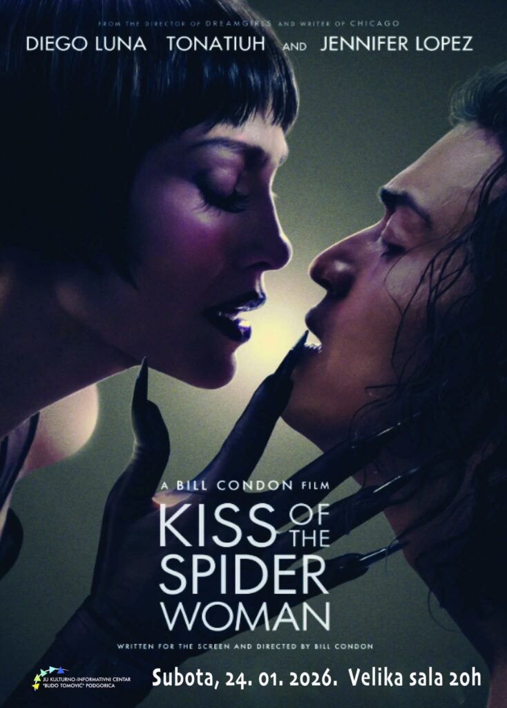 Film „Poljubac žene pauka/Kiss of the Spider Woman” (2025) inspirisan istoimenim romanom argentinskog pisca Manuela Puiga, biće prikazan u okviru revije „Mjuzikl – filmska rapsodija“ XII u subotu, 24. januara, u digitalizovanoj bioskopskoj sali KIC-a „Budo Tomović”, od 20 sati.