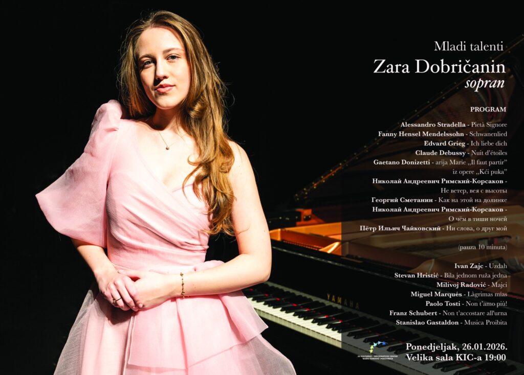 Kulturno-informativni centar „Budo Tomović” otvara muzički program u 2026. godini koncertom u okviru ciklusa „Mladi talenti”, posvećenog afirmaciji perspektivnih mladih muzičara. Sa zadovoljstvom najavljujemo prvi solistički nastup soprana Zare Dobričanin, koji će biti održan u ponedjeljak, 26. januara, u Velikoj sali KIC-a, sa početkom u 19 časova.